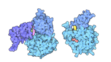 左图:Sirtuin1与Sirtuin激活剂白藜芦醇结合(洋红色)。右图:Sirtuin6与Sirtuin激活剂(黄色)和 NAD+(红色)结合。