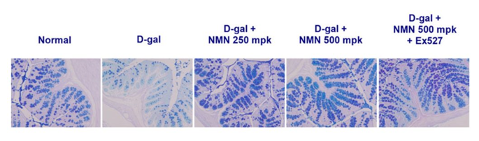 图片|NMN 介导的Sirtuin激活可改善杯状细胞。对肠道健康至关重要的杯状细胞在D-半乳糖小鼠中减少,如蓝点所示。然而,250 或 500 毫克/千克 (mpk) 的 NMN 可恢复杯状细胞的数量,而 Ex527 抑制 Sirt1 则可抑制杯状细胞的数量。