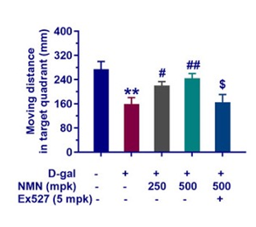 研究人员发现,衰老加速小鼠穿越目标象限的次数远少于正常小鼠。衰老加速小鼠的活动量也减少,在目标象限停留的时间也减少,这表明它们的记忆力受损。有趣的是,给衰老加速小鼠喂食NMN并没有显著增加穿越目标象限的次数或在正确象限停留的时间。然而,它确实显著增加了移动距离,而这种效应可以通过使用一种名为Ex527的化合物抑制Sirt1而消失。