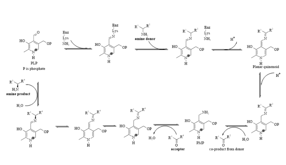 ω-转氨酶的催化过程由两个半反应组成,是典型的乒乓双反应机制(Ping-Pong Bi-Bi机制)。第一个半反应可分为三个步骤:①PLP与酶分子活性位点上的赖氨酸ε-氨基形成内部醛亚胺,随后胺供体的氨基亲核攻击PLPC4位,引发氨基转移,胺供体取代了赖氨酸并形成外部酰亚胺;②催化中心的赖氨酸残基结合胺供体的原子的质子,并将其转移至辅酶的C4位,从而生成酮亚胺中间体;③酮亚胺中间体水解,生成相应的酮和磷酸吡哆胺(PMP)。第二个半反应可以视为前一个半反应的逆反应:PMP的氨基基团亲核攻击底物酮的原子,并通过脱水缩合形成酮亚胺,再通过质子转移形成内部醛亚胺结构,并最终释放出手性胺和PLP